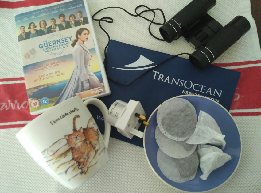 Wir werden in Außenkabine reisen und sind gespannt was uns erwartet. Als Einstimmung haben wir uns ein Youtube-Videos über das Schiff angesehen. Die Kabinen sind ansprechend gestaltet, wirken geräumig und gut ausgestattet. Bemerkenswert finde ich, dass einige Kabinen über einen DVD-Player und über einen Wasserkocher verfügen. Finde ich beides toll und keineswegs selbstverständlich. Ins Reisegepäck kommen also auch die DVD „The Guernsey Literary & Potato Peel Pie Society“, (bei Amazon als Buch, Hörbuch, DVD erhältlich) meine Lieblingstasse und ein paar Extra-Teebeutel für den Morning Tea.